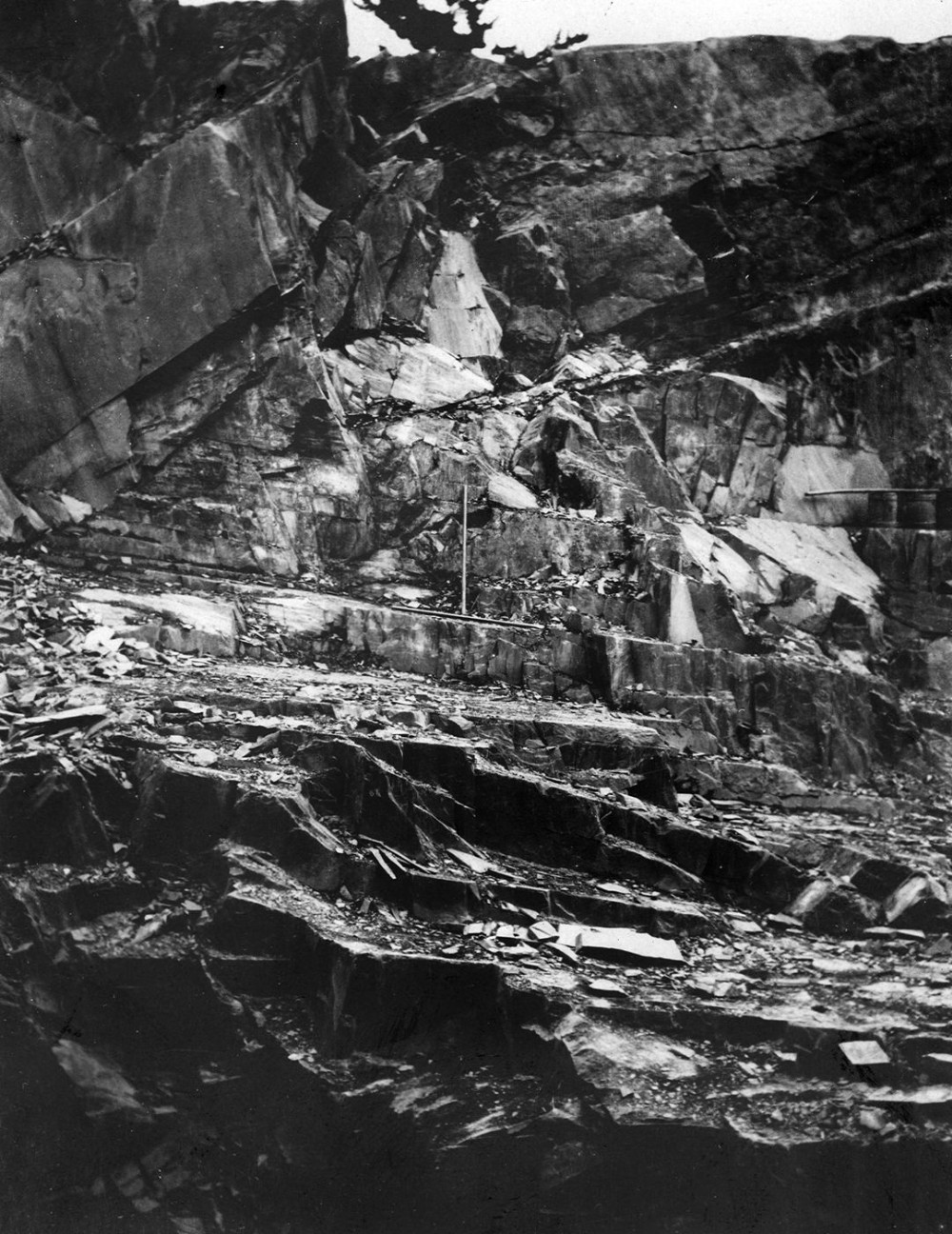 Looking south in Eureka slate quarry showing horizontal joints cut by cross joints. Quarry owned by Monson Maine Slate Company. Monson, Piscataquis County, Maine. Circa 1905.