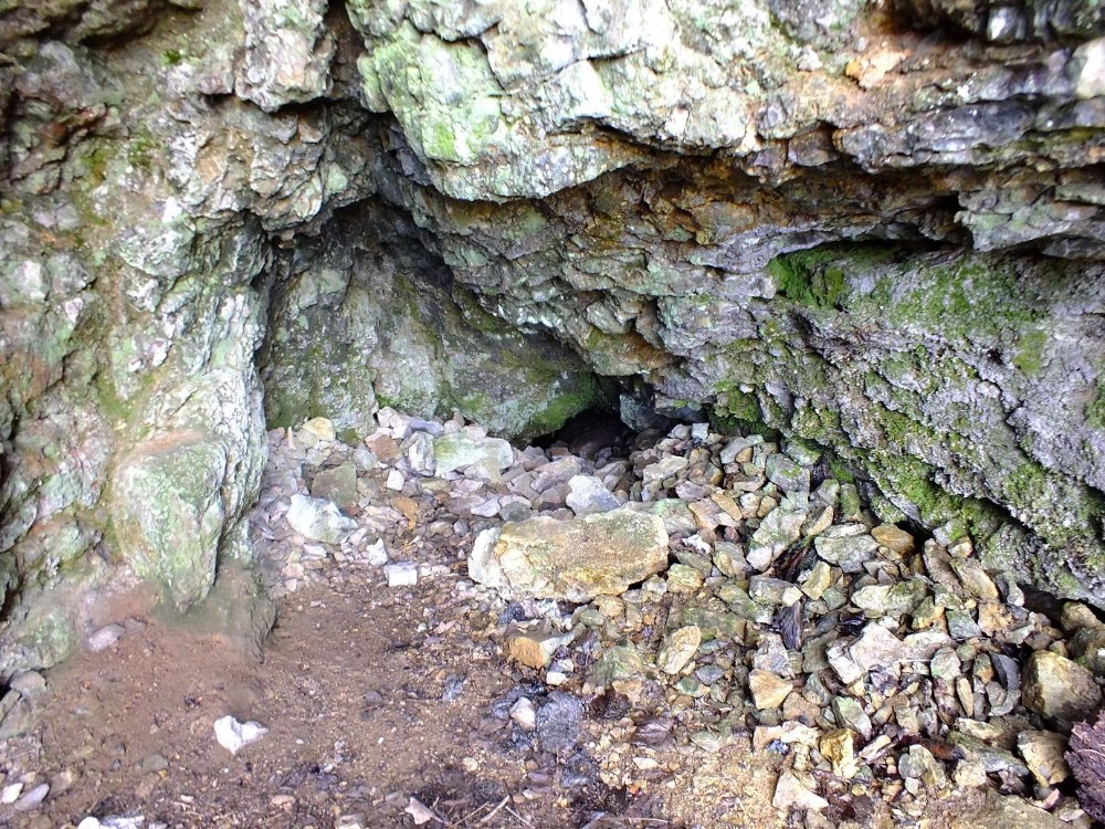 The roof and walls look fairly unstable with a barn and trees above, the entrance to this old short working is filled with rocks and rubble