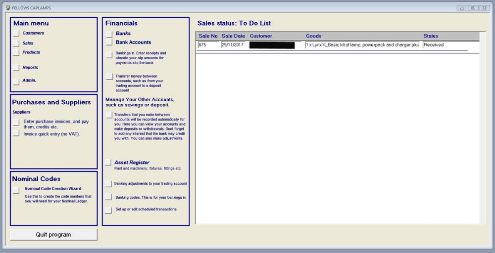 This is the main screen of the bespoke software that runs Fellows Caplamps (LEDCaplamps.com). Developed by me (Roy) in MS Access and Visual Basic, this was my trade at one time.