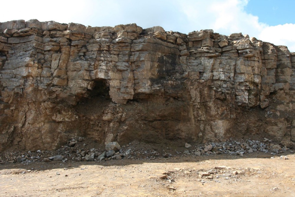 The South face, mineralised limestone below unaltered above and a row of flats at the top of the mineralised rock.