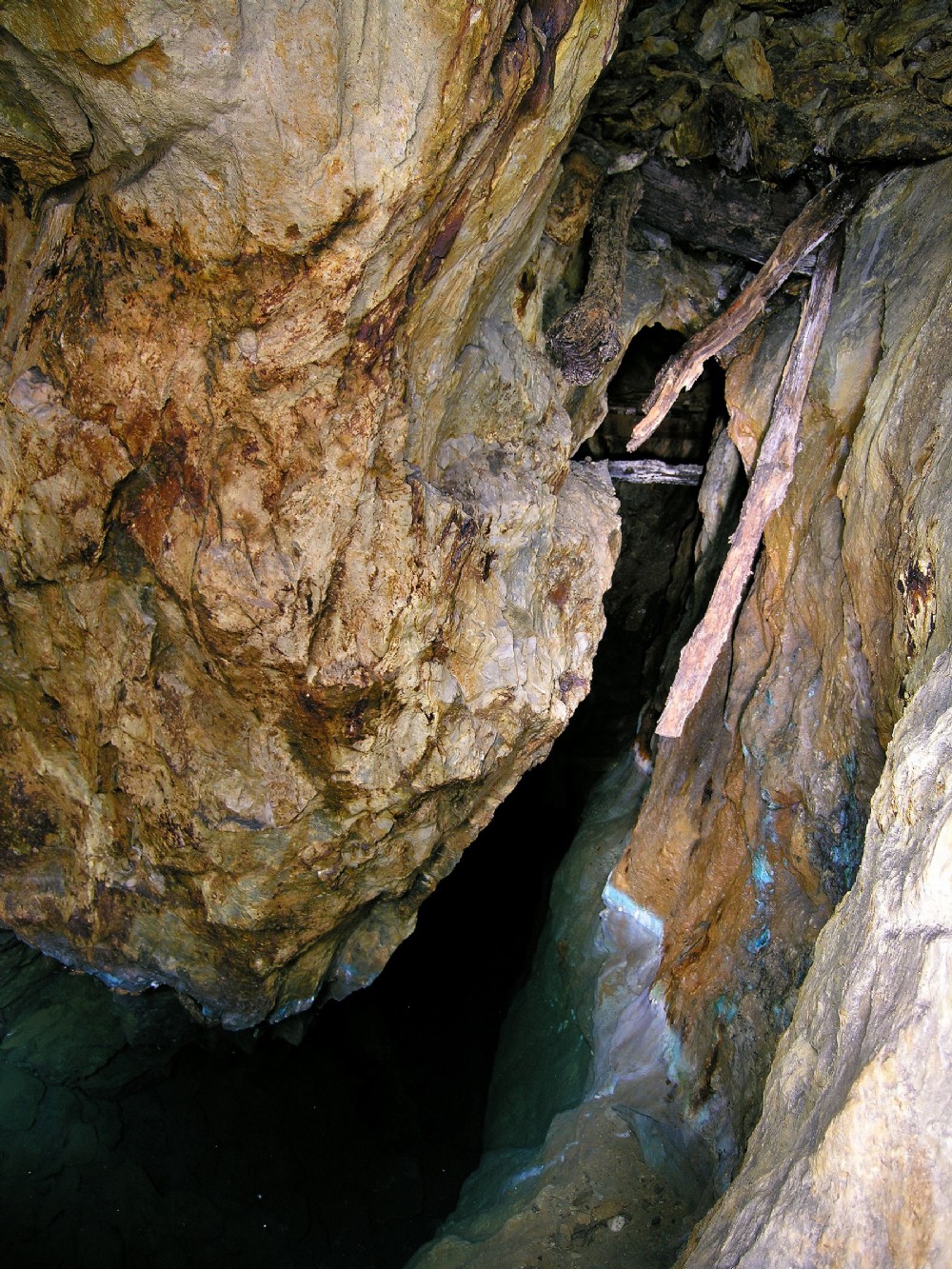 A flooded stope, decayed stemples in view holding back backfill from above.