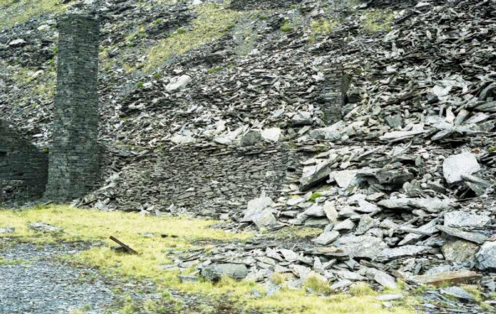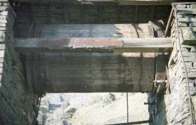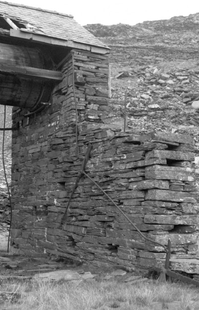 Behind the mill was the odd Floor 1/2 - which went all the way from the adit to the ar southern side - where it ends, buried by later tipping which has flowed over it. However, a clue remained as to its purpose - the slab wall you can see centre right. All that remains, we believe, of the original drumhouse whose incline connected Floor 1/2 with the Office Floor, before the mill was built. It lines up exactly...