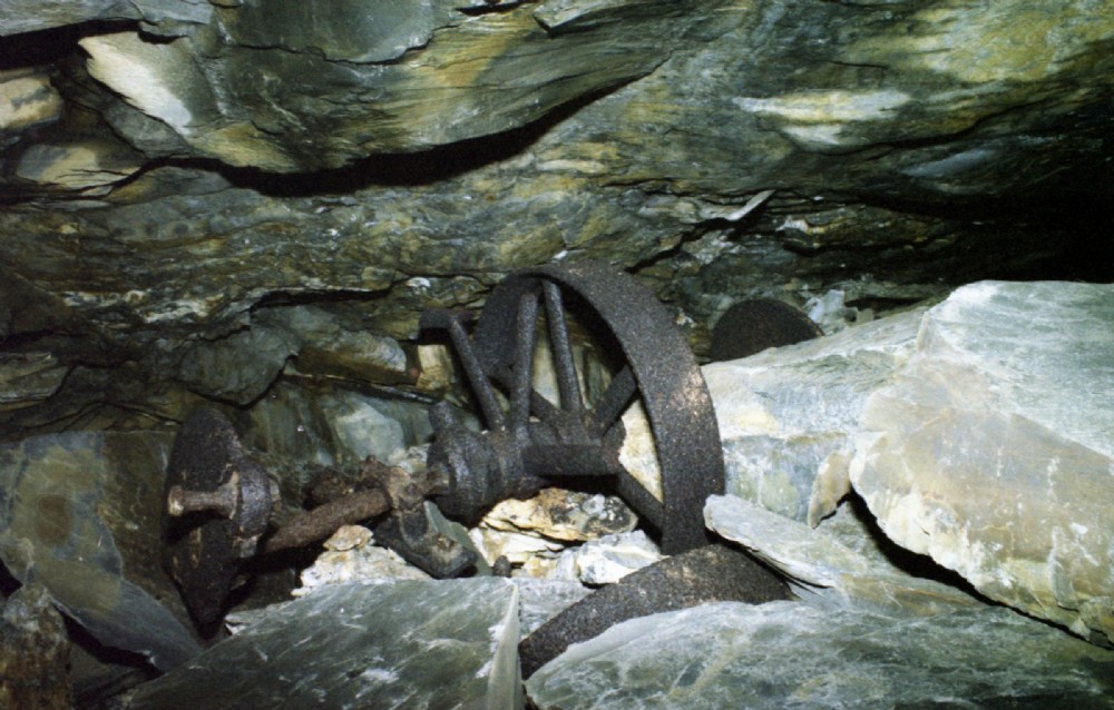 We found this fascinating relic in an adit - after sliding over water-glass to get to it. This is the driving axle of one of the double sided dressers, fast and loose pulleys in the middle and a disc crank at each end to drive the oscillating guillotine blades.