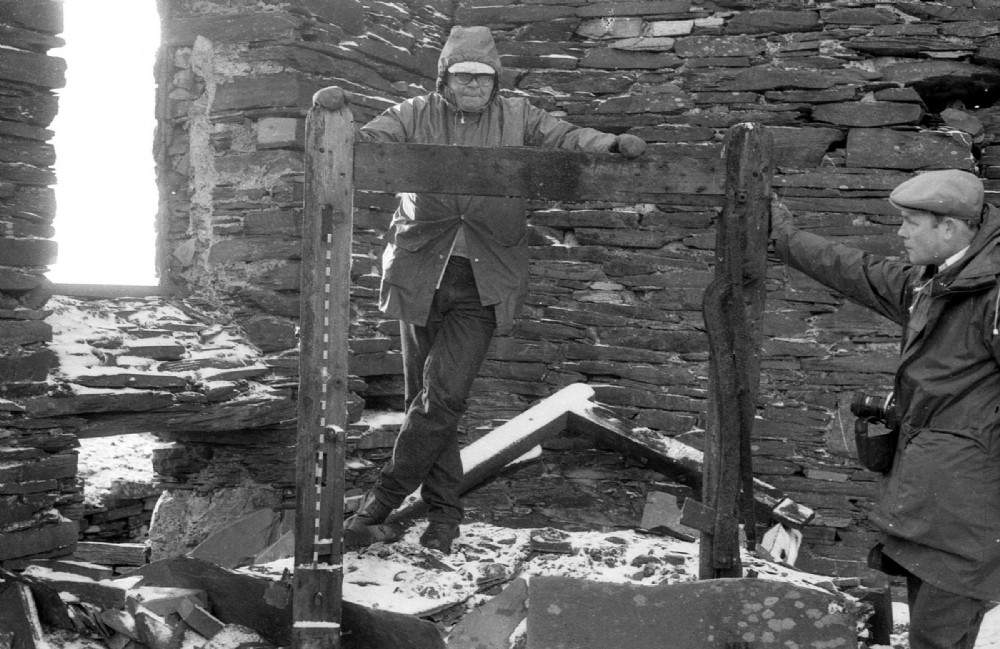 The side of a dresser is resurected for measurement - no it wasn't an unseasonal blast, we went back in December to check our ideas, having found the remains of the archetypal Mathews dresser in the ruins of Votty A Mill - this was different!