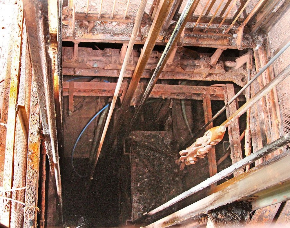 Looking down onto the cage at the Florence Ironstone Mine. Above the cage is the Humble patent detaching hook.