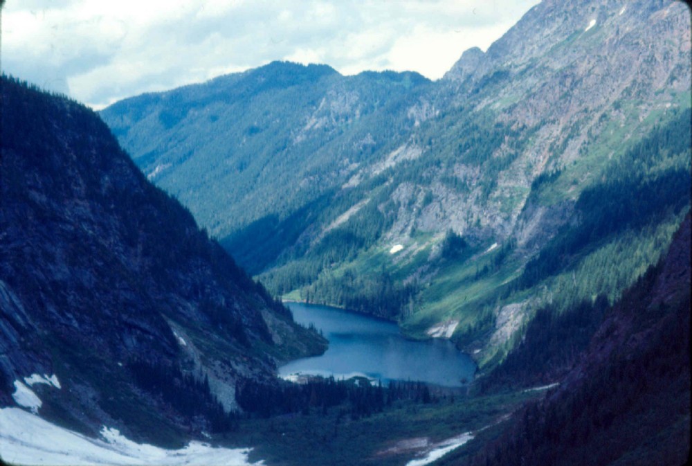 Goat Lake, from near portal of Foggy Mine. Main camp for mine in valley below lake, Photo taken 1974.