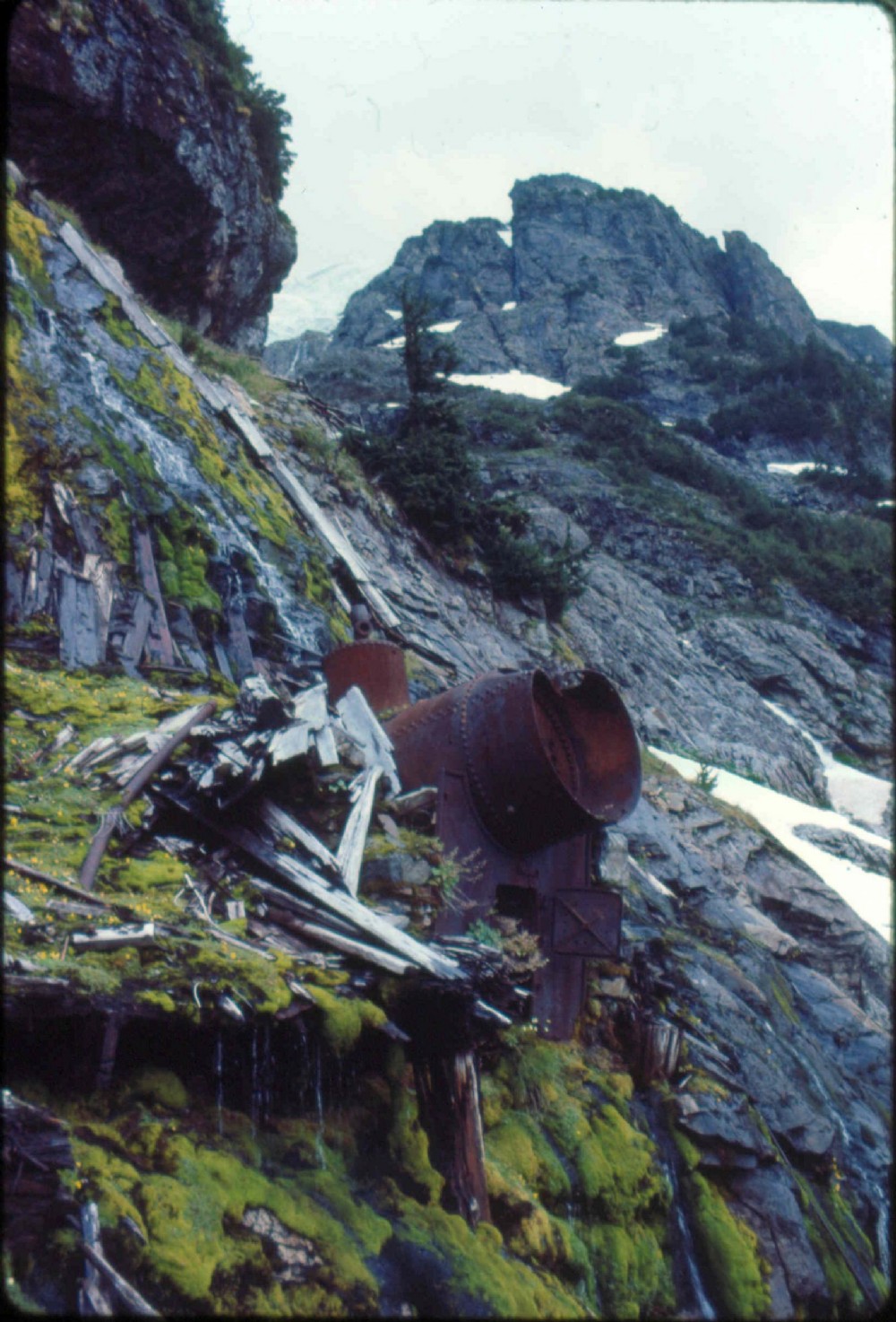 Boiler, on level with ledge several dozen feet below main adit. Main adit in notch upper left. Photo taken 1974.