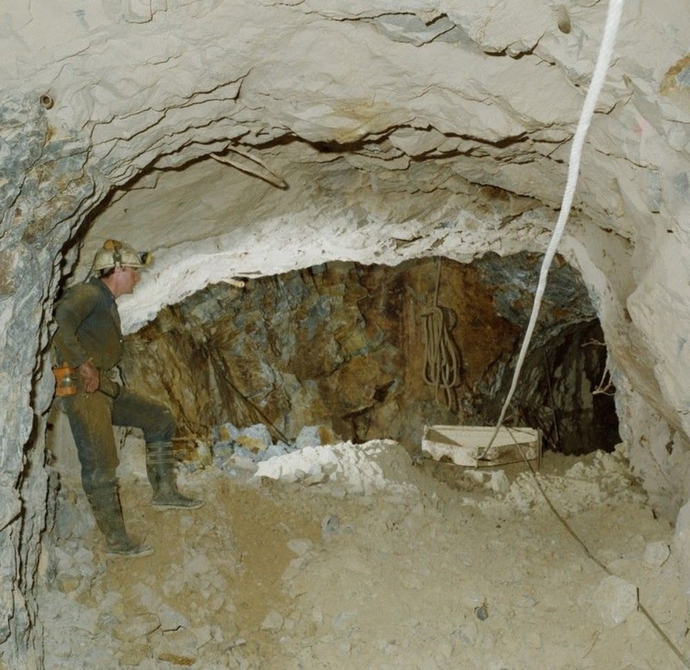 Foss Barite Mine, Aberfeldy, Perthshire. The 670 m. level B1 stope. Pulling ore to a drawpoint by means of a slusher. Broken barite which covers the floor is pulled by this scoop attached to a wire rope wound by a drum to an opening, down which it falls to be collected by an underground dump truck.