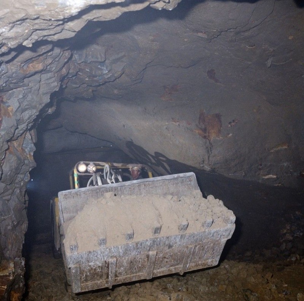 Foss Barite Mine, Aberfeldy, Perthshire. 660 m. level barite drift. Removing blasted barite in a LHD (load-haul-dump unit) bucket carrying 3 1/2 tons of ore. The ore has recently been blasted from the stope, hauled to, and dumped down a drawpoint. The LHD units are highly manoeuverable and powerful rubber-tyred machines and are usually powered by diesel engines with exhaust-conditioning devices.