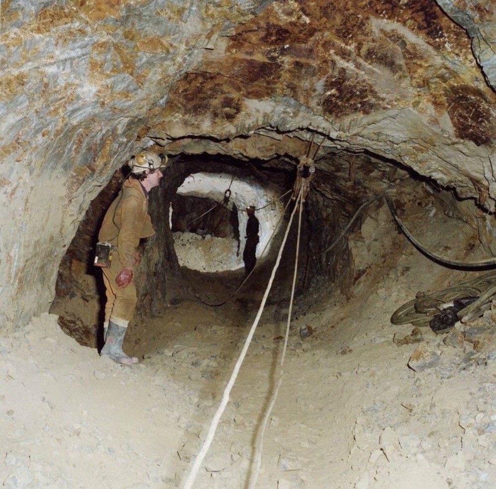 Foss Barite Mine, Aberfeldy, Perthshire. The 670 m. level B1 stope. The slusher pulley and wire rope system allowing forward and backward pull of slusher. The slusher is a mechanical drag shovel loader used to pull recently blasted ore to the top of a drawpoint or raise where the ore falls to be collected at a lower level by an underground dump truck.