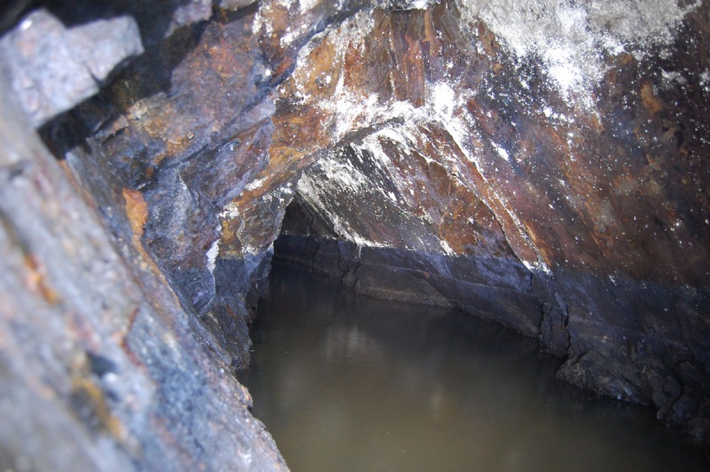 View toward the darkest depths of the mine. The shadow under water is the winze. ( I am not 100% sure about the shadow beyond the winze as one lacked the testicular fortitude to proceed any further on the day. )