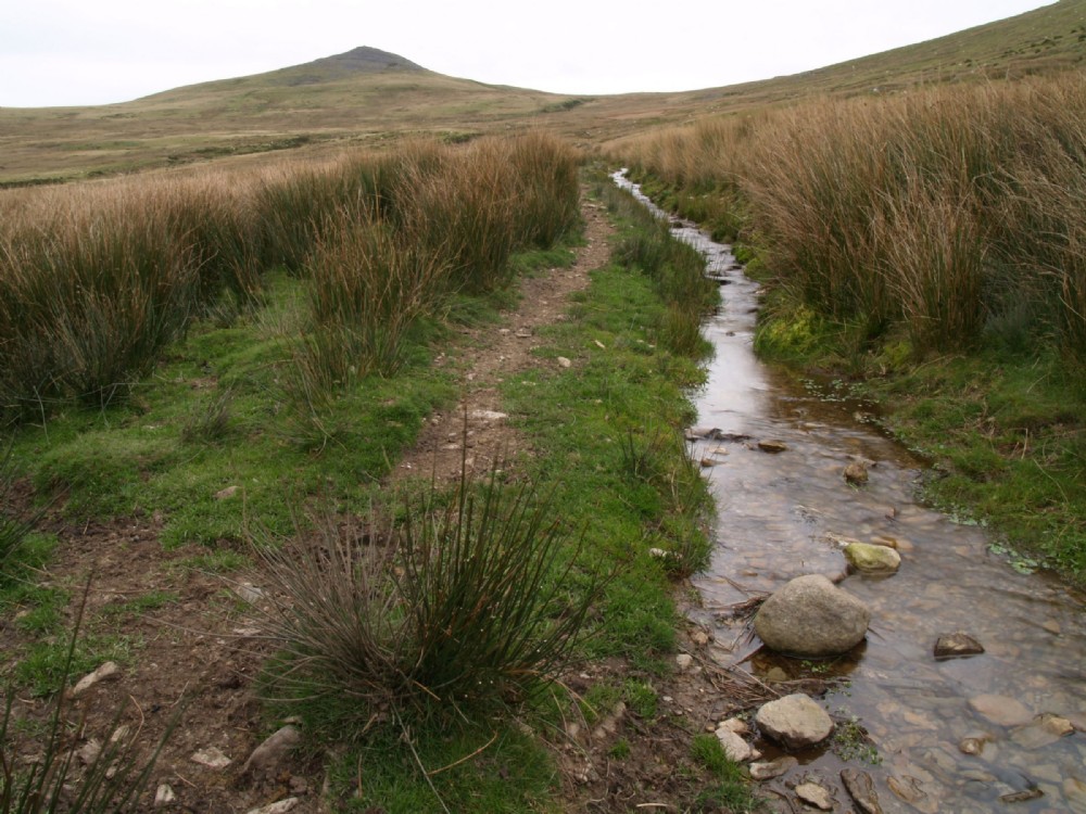 Landscape view from S.W. The working is just below the horizon, above path and stream. Gyrn in the distance.