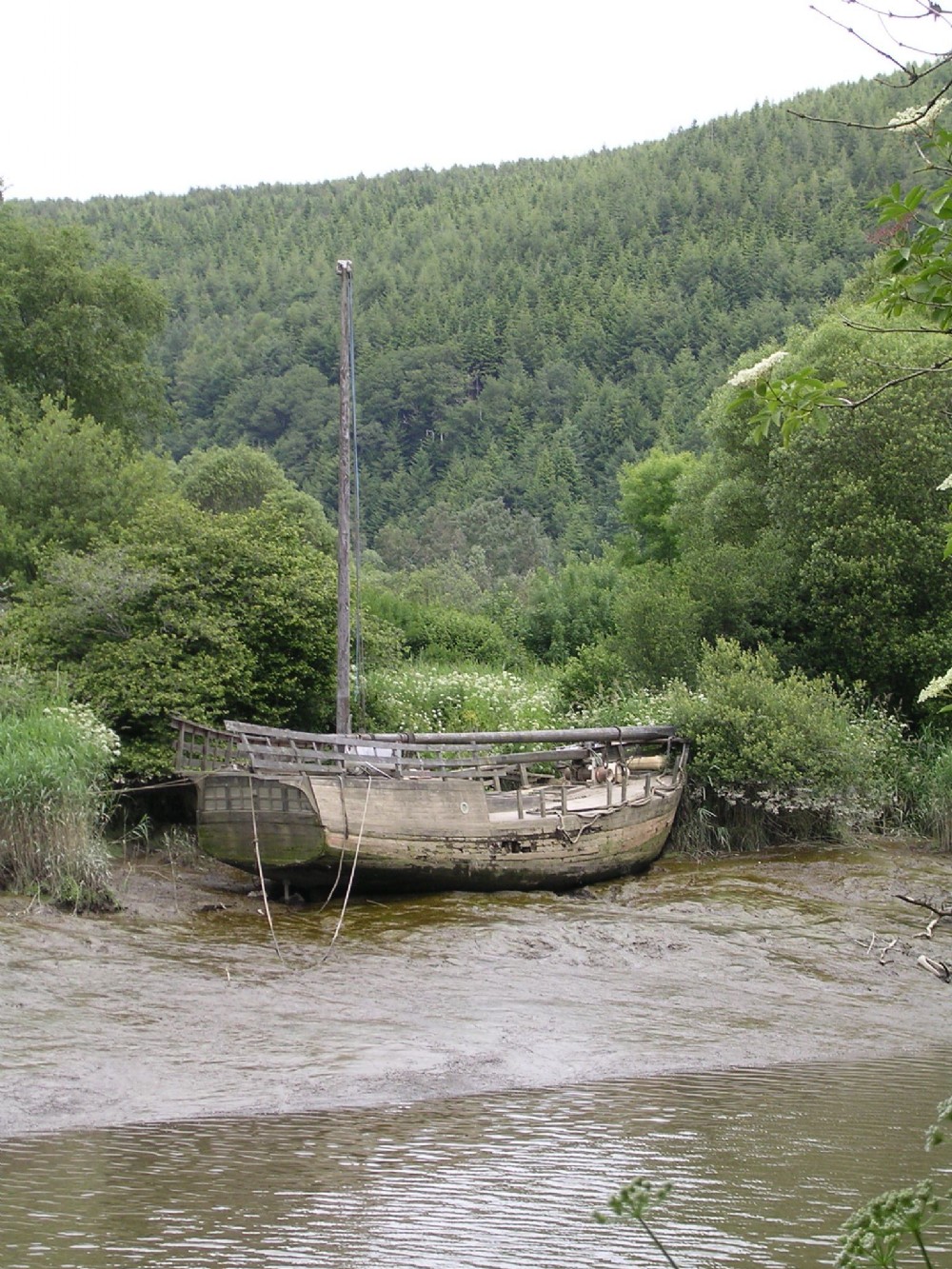 A lick of paint and she'll be as good as new! Old sailing ship stranded for ?years on the Cornwall bank of the Tamar opposite the Gawton site.