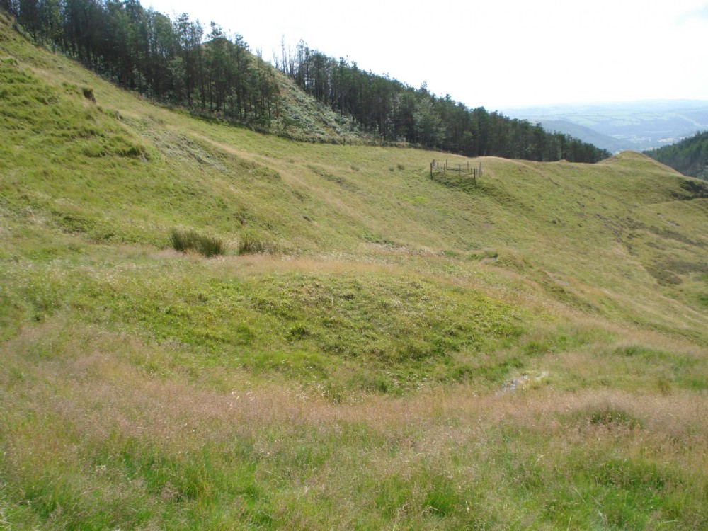 Looking along minor workings on the vein west towards Bwlchyrennaid Shaft (note leat running along the right of the photo).