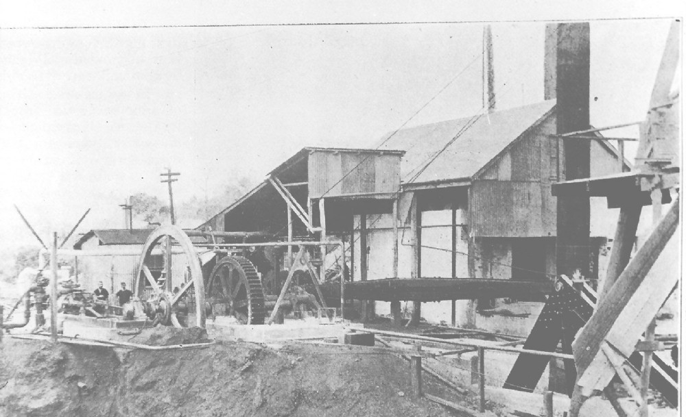View across open cut to steam engine and gearing to flat rod drive for beam pump.