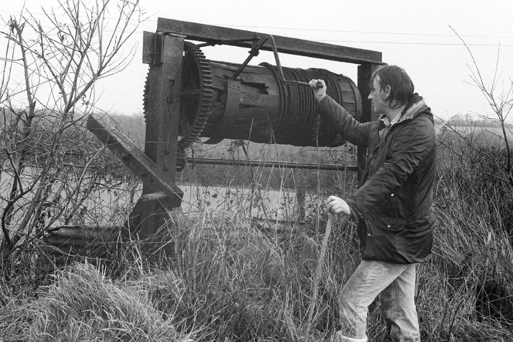 Jack roller (or 'Jinny' roller) for emergency access for Gitchfield Mine, driven in 1892 by Joseph Exley to supply his new Coalport Tileries (now water works site) with clay (and some coal). Clay was also taken to Exley's Jackfield works. This shaft is about 400m from the portal, and over 40m deep. It was fitted with a windlass for emergency access/escape. The Mine abandoned in 1956. Since this picture was taken on 20th December 1983, the shaft has been filled in.