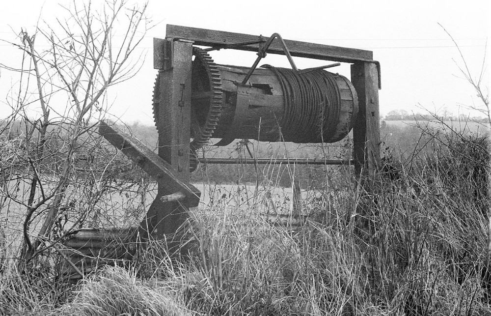 Jack roller (or 'Jinny' roller) for emergency access for Gitchfield Mine, driven in 1892 by Joseph Exley to supply his new Coalport Tileries (now water works site) with clay (and some coal). Clay was also taken to Exley's Jackfield works. This shaft is about 400m from the portal, and over 40m deep. It was fitted with a windlass for emergency access/escape. The Mine abandoned in 1956. Since this picture was taken on 20th December 1983, the shaft has been filled in.