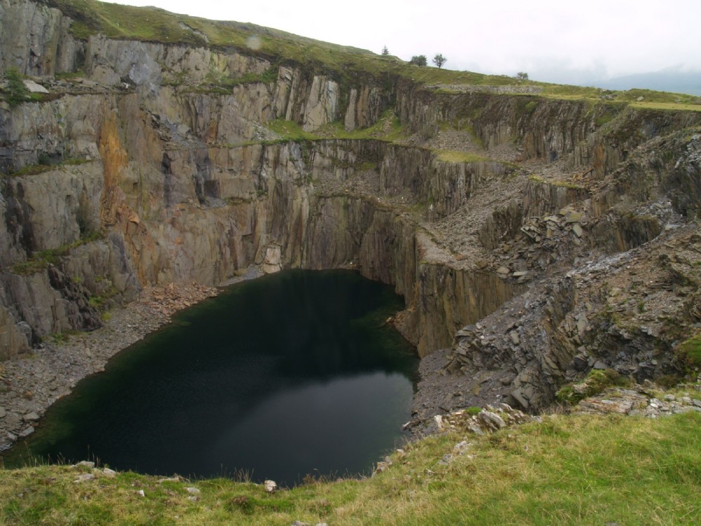 View of the flooded pit, looking South. Some areas of the pit walls are noticeably spalling away.