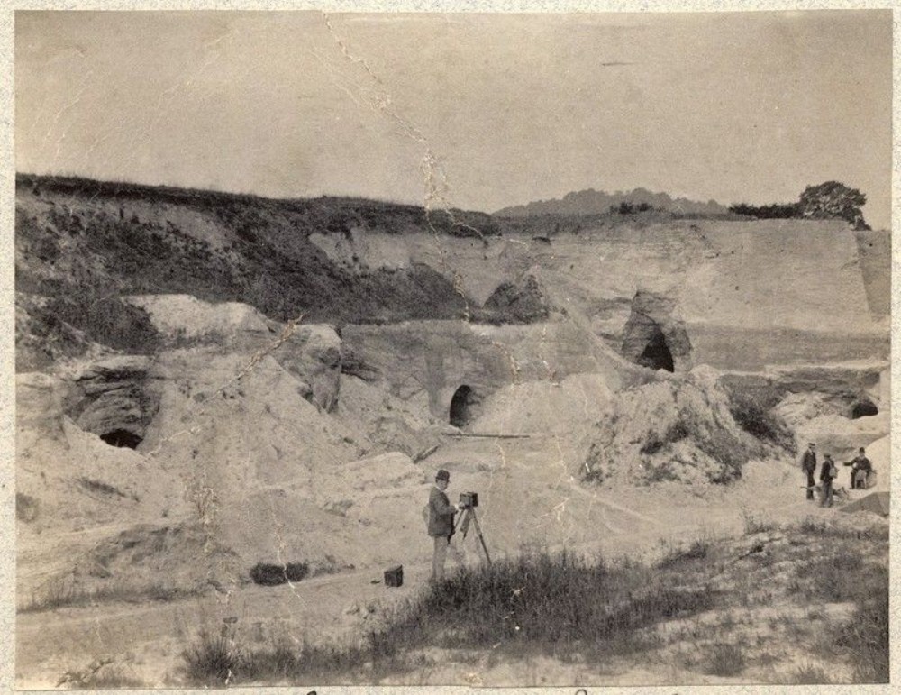 This photo shows the large village sand pit with older mine galleries exposed in the sides. The caption is wrong - these sand pits worked the Lower Greensand, Folkestone Beds.