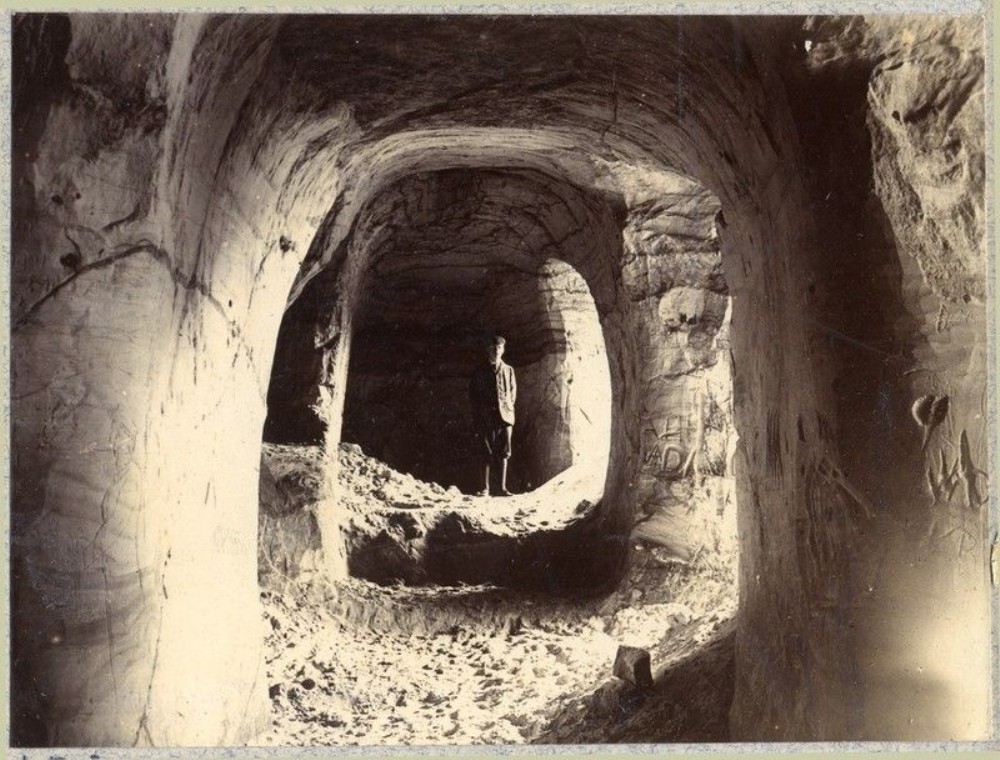 This photo shows pillar and stall galleries within reach of daylight, presumably from the open pit close by.