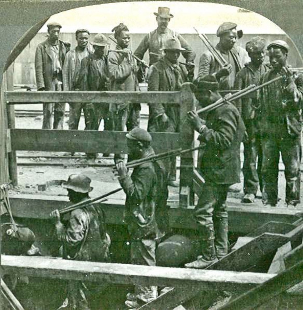 Miners Going underground at the Robinson Deep Gold Mine, Witwatersrand, So Africa, circa 1900.