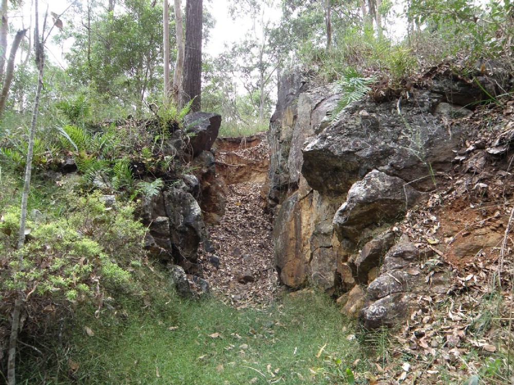 The small open-cut at Golden Boulder northeast of the shaft. Weathered pyritic quartzitic 'ore' can be seen in the right hand wall.