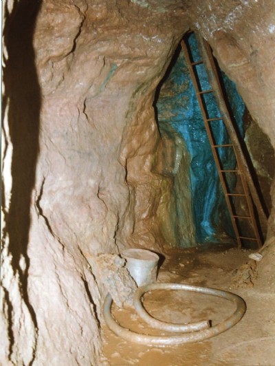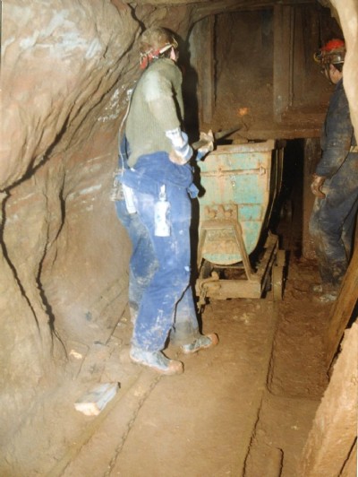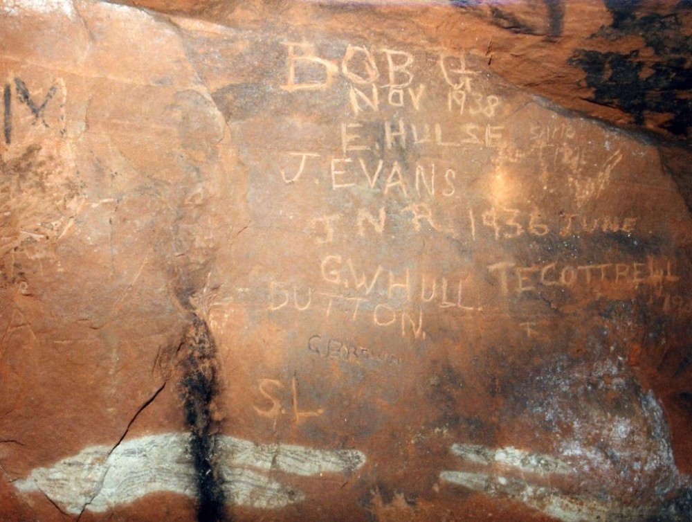 Graffit from the 1930's on the wall of the Hough level by the remains of one of Evans (the Hermit) timber boats, circa 1987