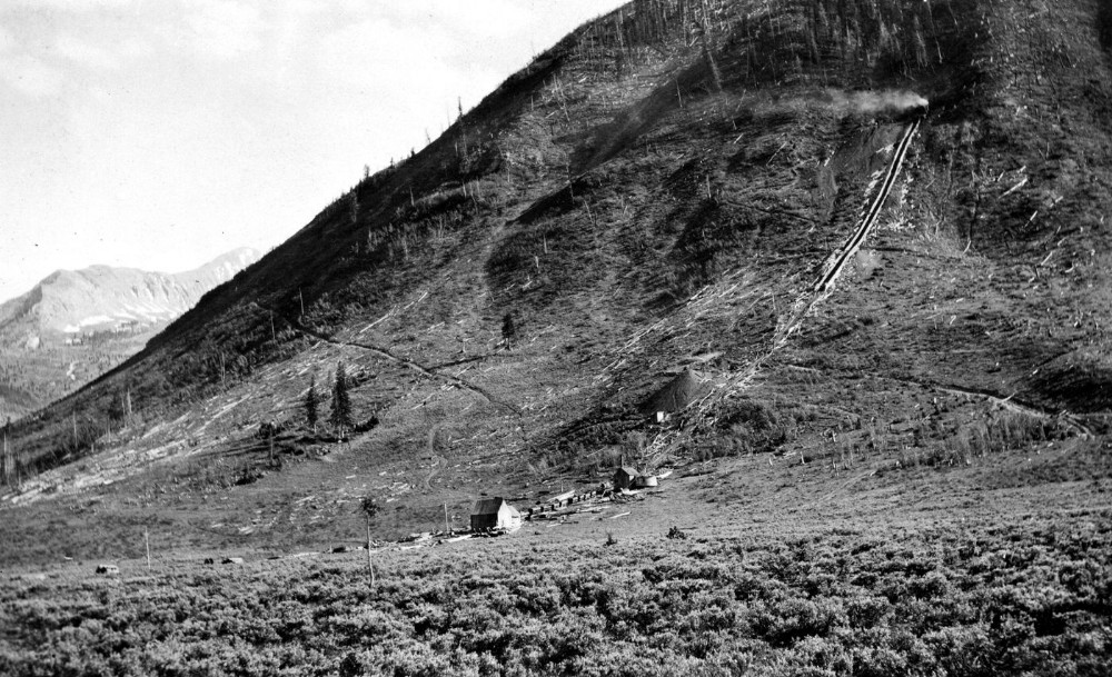 Looking south toward the Porter Mine from the wagon road east of Crested Butte. Shows the gravity incline over which the coal is lowered from the mine to the railway.