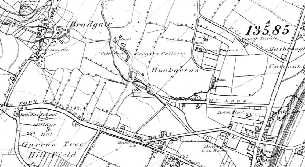 OS map extract showing the colliery site with shaft and coke oven. The site later became a brickyard. Bradgate Colliery opened in the 20th century a few yards to the north west. This appears to have been an adit driven into the side of a quarry on the 1930s OS map.