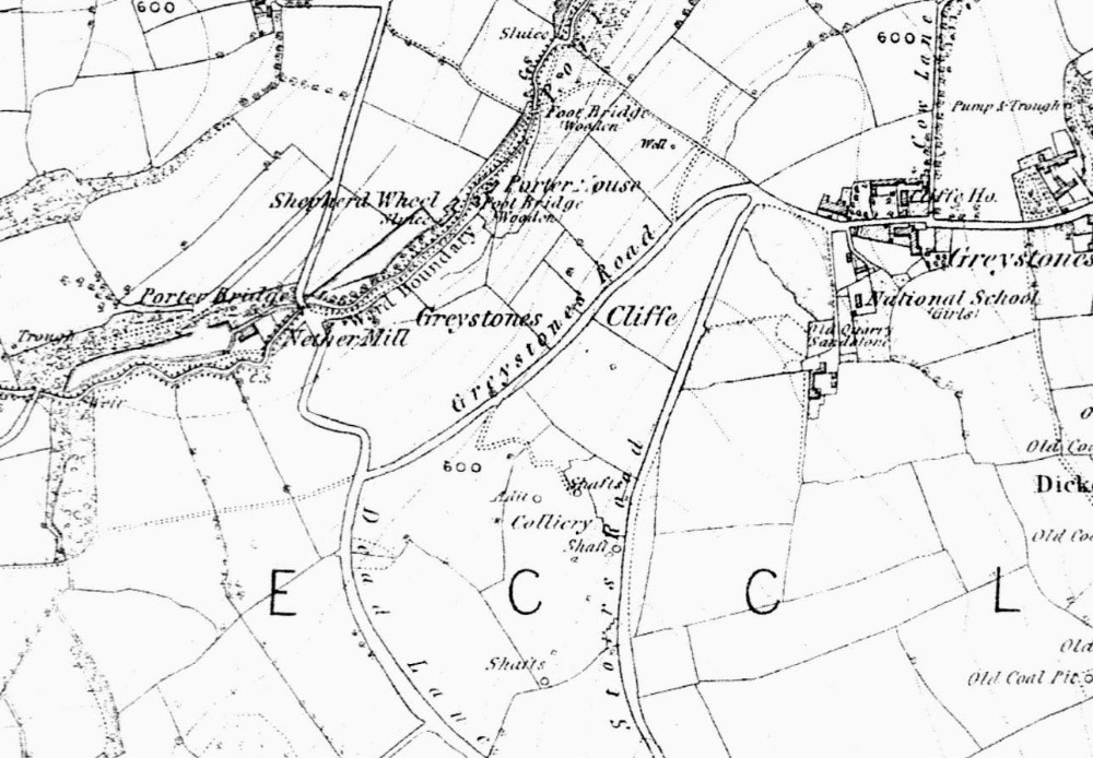 Extract from the 1850 Ordnance Survey map showing three shafts and an adit at the Greystones Colliery site.