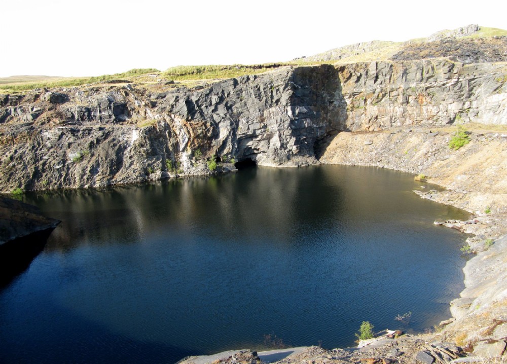 Large hole appears to be the top of a flooded chamber. Very little access (by boat) as the ceiling soon reaches the water. Smaller opening to the left is accessible through a passage from the far left.
