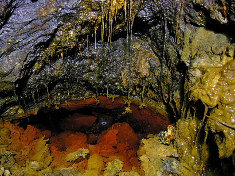 A small grotto of straws and mineral formations / staining. xx fathom level, Parys Mountain copper mine.