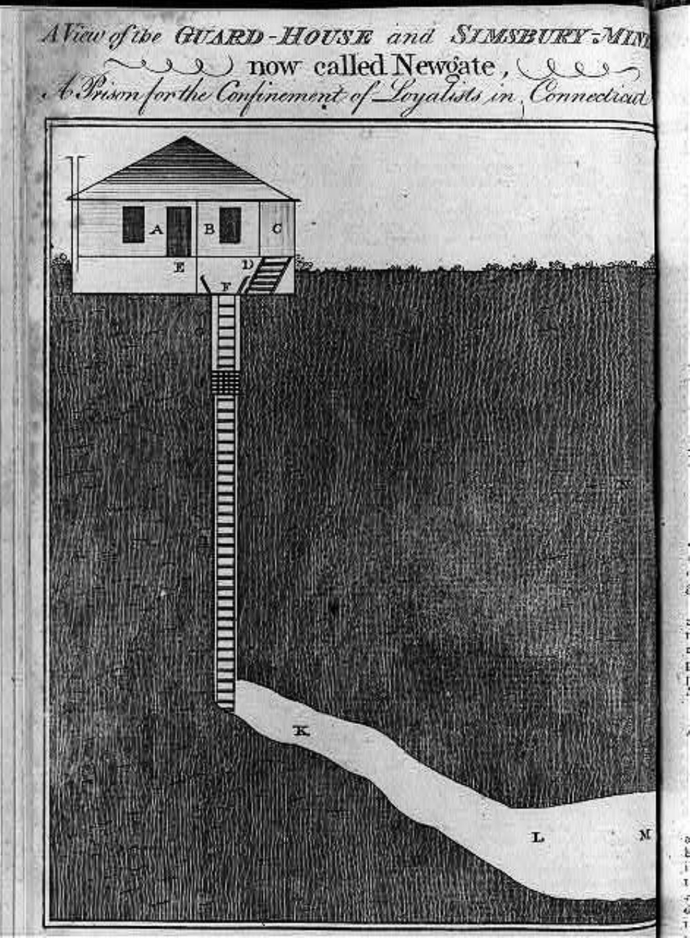 A view of the guard-house and Simsbury-mines, now called Newgate - a prison for the confinement of loyalists in Connecticut.