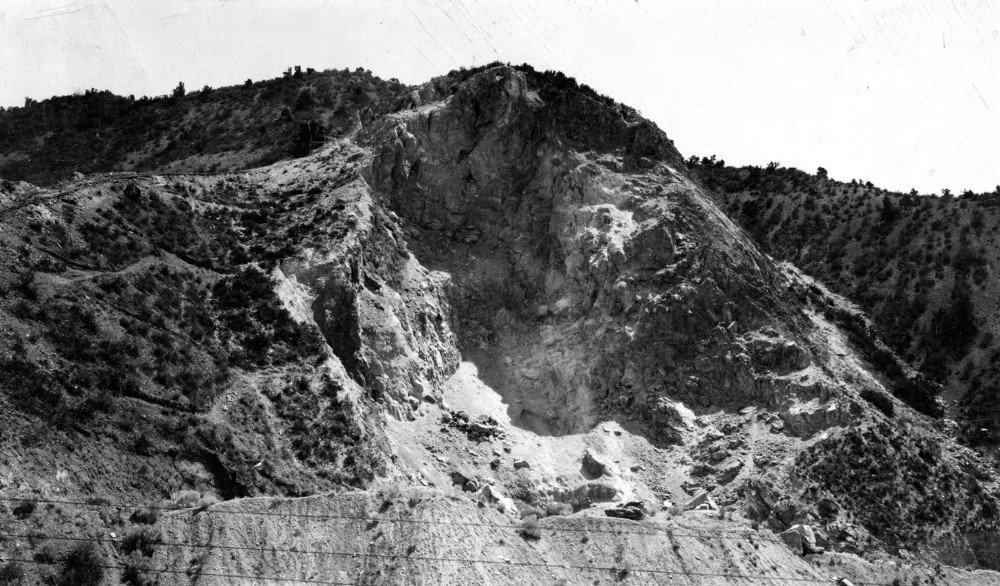Gypsum quarry Nephi Plaster & Manufacturing Company. Quarry face nearly 500 feet high. Mining in 1916 by drift and glory hole above loading shed at upper end of tram. Nephi, Juab County, Utah. August 1916.