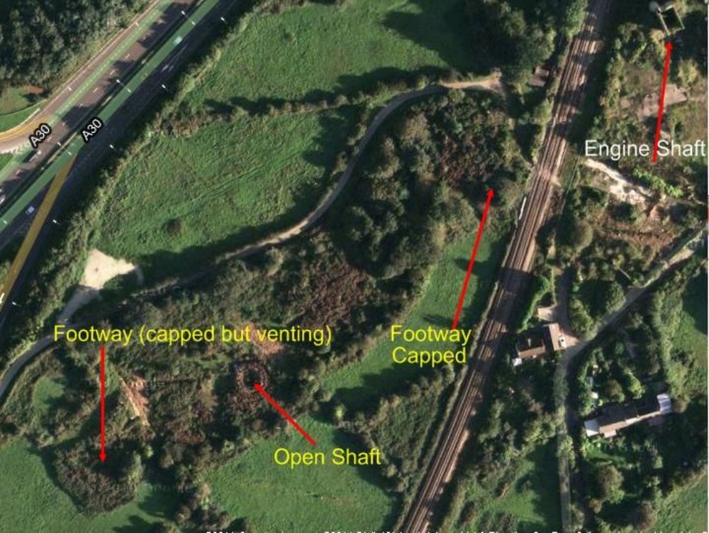 This is a google earth snap of the current site layout showing the position of the shafts. Of particular concern is the open shaft and the associated footway (which is an important ventilation route).