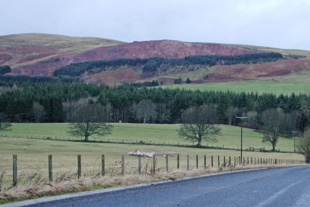 Harden Quarry, the distinctive red colour of the laccolith is obvious even at a distance.