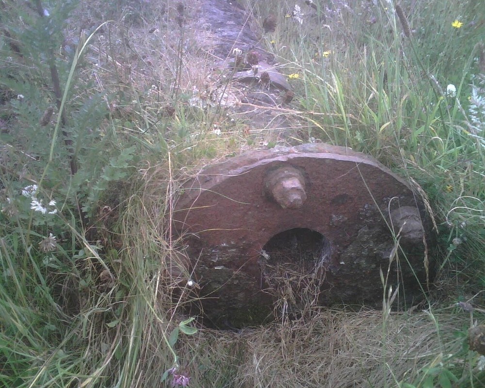 All undergrowth has died back revealing flange and bolts on old pipe by foot of concrete winder mountings at Harriet shaft Dolcoath.