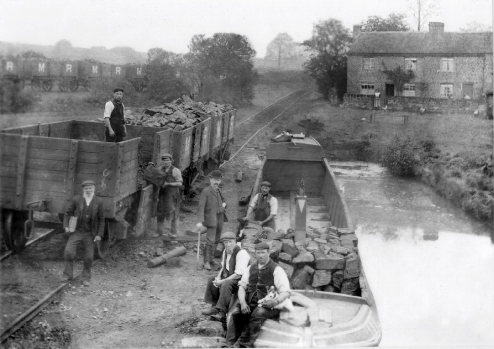 The wharf at the Cromford Canal end of the Pentrich and Oakerthprpe Tramway after it had been converted to standard guage and shortened by the building of the Ambergate to Pye Bridge Railway line in the 1870s. The coal (note the size of the lumps!) is from Haslam's Pentrich Colliery closed in 1944. Photo estimated at c1900