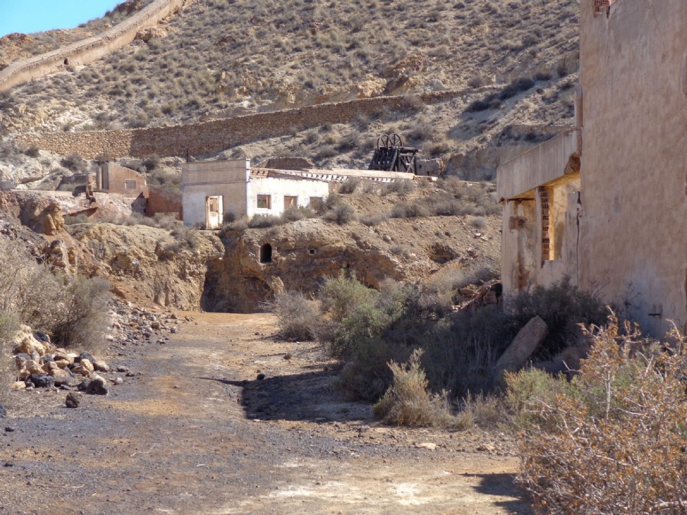 View of the headframe and associated buildings from the quarry-like excavation to the west. Note large flue ascending the hillside beyond.