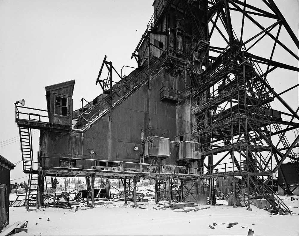 ANSELMO HEADFRAME LOOKING NORTHWEST. THE DEBRIS ON THE LEFT IS WHAT REMAINS OF THE SLIME PLANT. THE ORE SORTER IS TO THE LEFT OF THE HEADFRAME, WITH TRACKS BENEATH