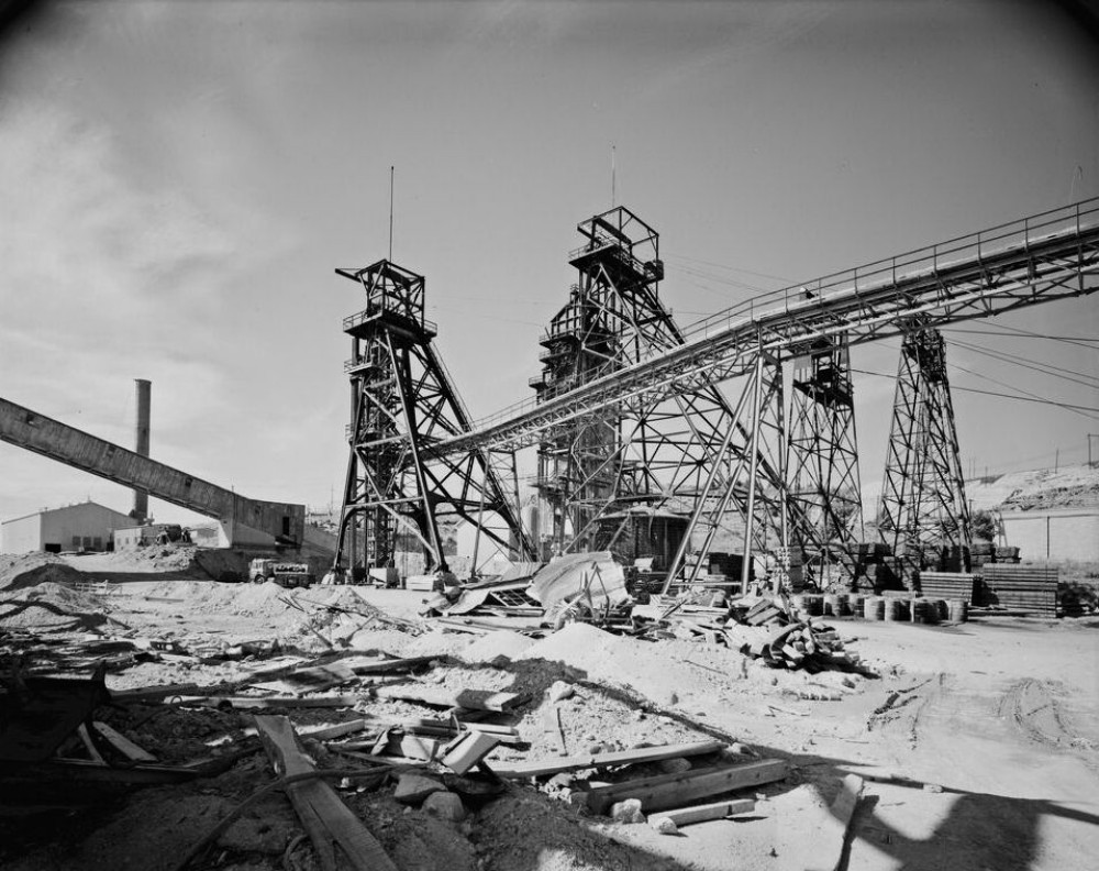 VIEW OF THE KELLEY MINEYARD SHOWING THE TWO HEADFRAMES AND THE OVERHEAD PIPE TRESTLE, LOOKING NORTHWEST