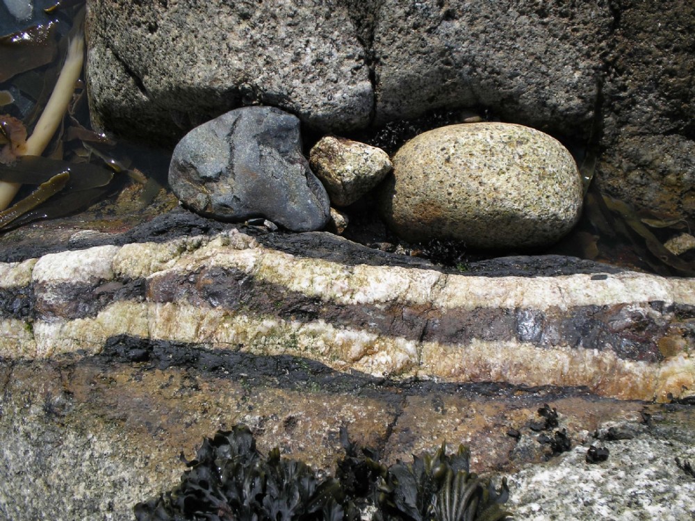 The lodes can be followed across the beach into the sea. This rich lode comprises garnet with two quartz leaders enclosing very rich cassiderite.