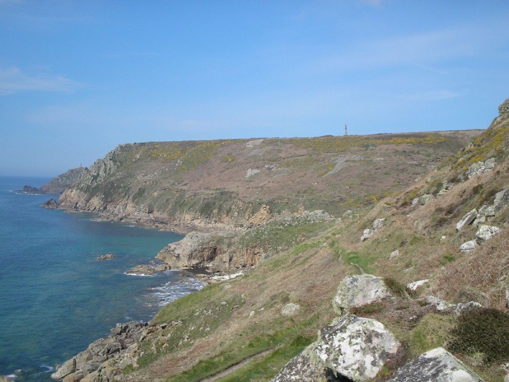 View looking north-west with Cape Cornwall Mine stack in the extreme distance (left) and stack of Ballowall Mine on the right.