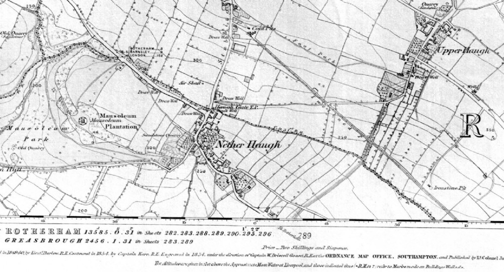 Map extract shows the upper part of the Stubbin inclined plane in 1850. The eastern extremity of the Wentworth Woodhouse park with the Fitzwilliam mausoleum appears to the left of the extract.
