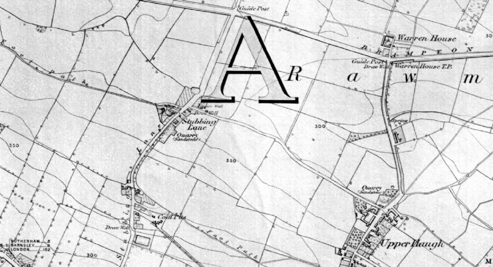 Map extract shows "Coal Pits" at Higher Stubbin. Additionally, the extract also shows the later sites of Low Stubbin Colliery (top centre below the large letter A, and Warren House Colliery (the rectangular plantation in the top right hand corner).