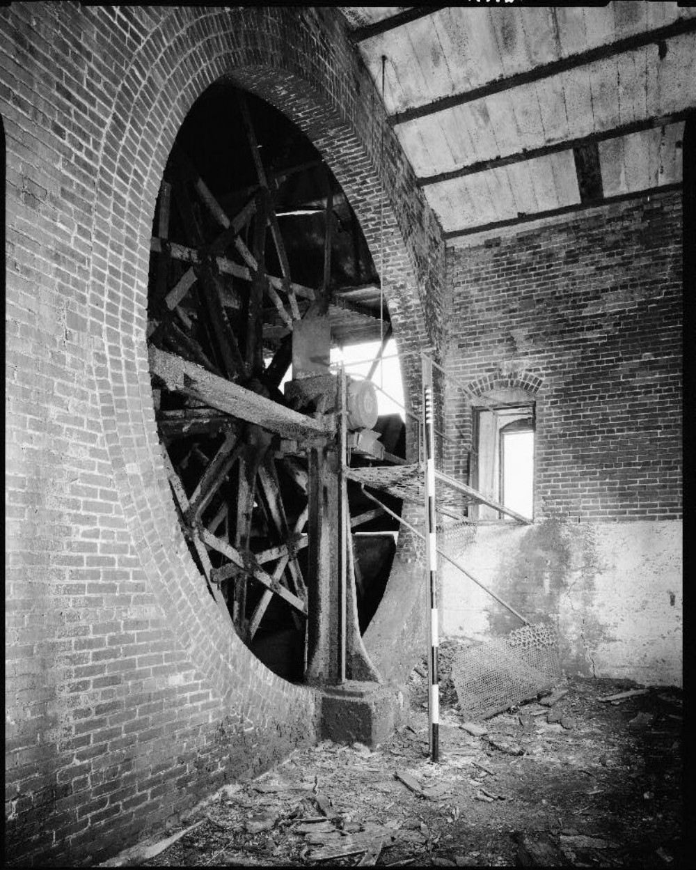 INTERIOR VIEW OF HILLMAN FAN HOUSE LOOKING NORTHEAST This view, taken in the southern airway, shows the circular brick-work surrounding the air intake, the cast iron shaft support, and one of the 1883 Guibal fan cast iron spiders. Three cast iron spiders support the ten feet by eleven feet wooden paddles. Remnants of the catwalk with its screen grating lead to the inner door of the airlock. Note also the support beams and reinforced concrete roof. The concrete floor of the airway has deteriorated.