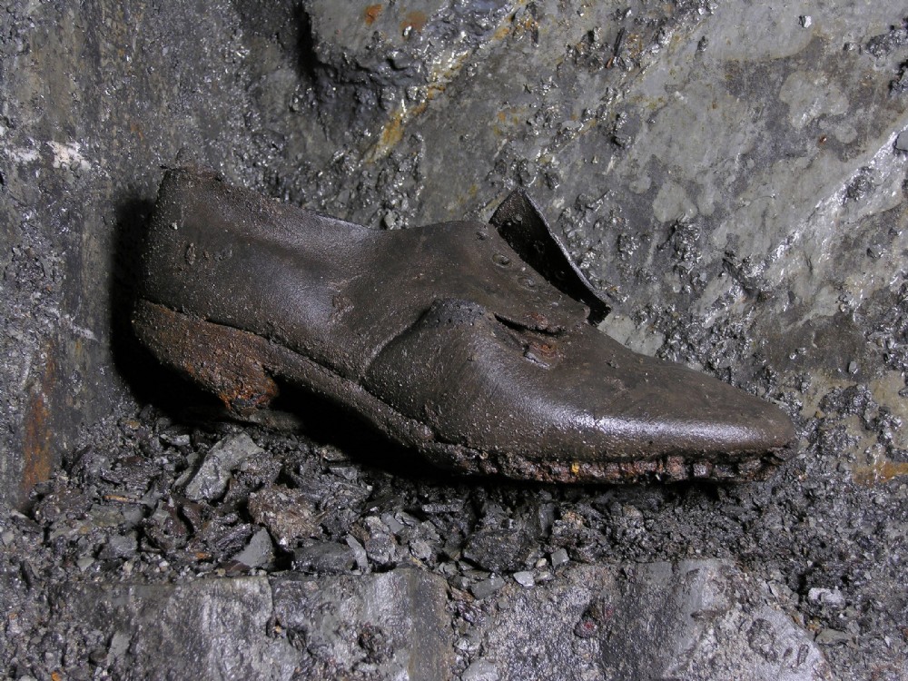A hobnail shoe, found and photographed in situ in the deep adit level at Bwlchglas.