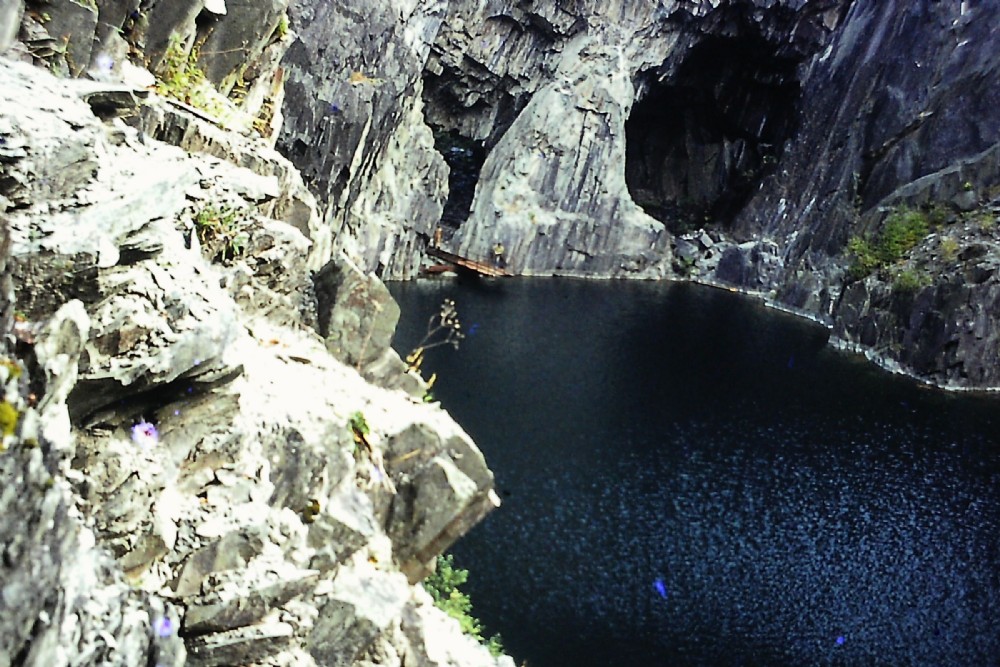 View of flooded workings at the quarry, remains of staging, with two explorers inspecting it, just above the water level ( it looks a little more intact than GavinNewcombe's pic in the archive). Presumably the same staging as Captain Scarlet's 2007 pic looking out from the underground chamber in the current album.