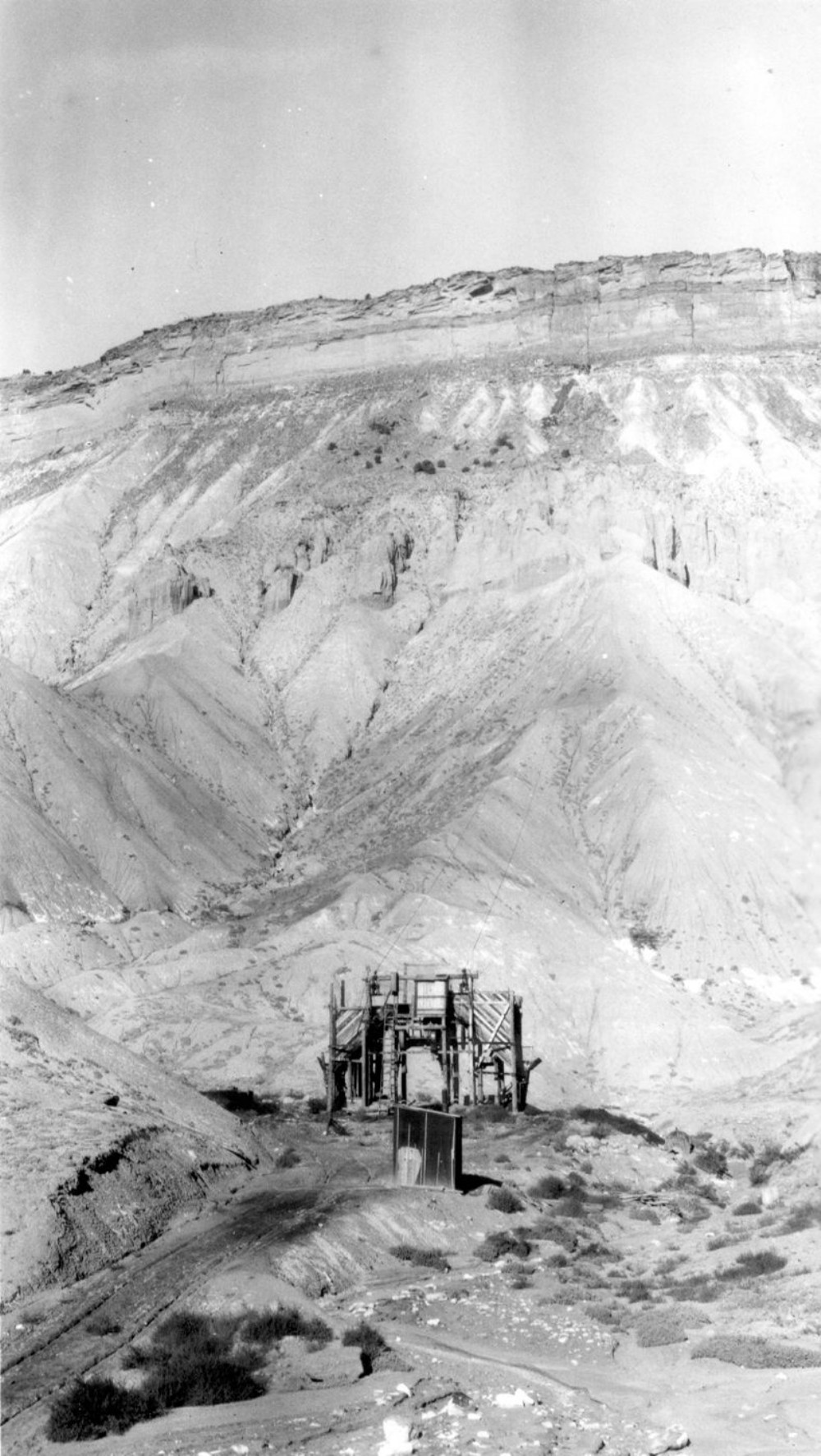 Service coal mine at foot of Book Cliffs. Hoisting plant and tipple in foreground. Cables lead to mine in Palisade Coal near foot of vertical sandstone cliff, northeast of Grand Junction. Mesa County, Colorado. 1927.