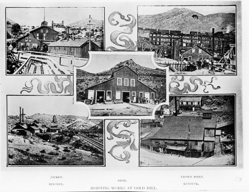 Hoisting works at Gold Hill. Jacket. Belcher. Alph. Crown Point. Kentuck